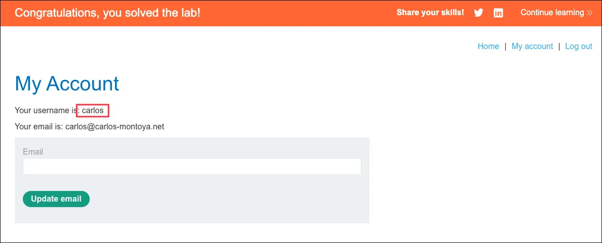 Section titled “Exploit”Login as carlos, after the credential is successfully validated navigate to https://0ac0006a04c16c738008358a00400035.web-security-academy.net/my-account?id=carlos