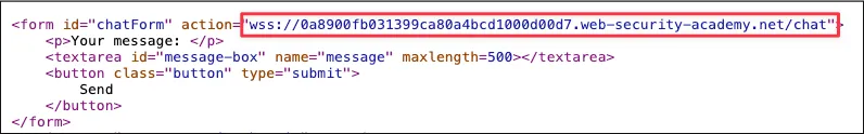 <script> const ws = new WebSocket('wss://0a8900fb031399ca80a4bcd1000d00d7.web-security-academy.net/chat');